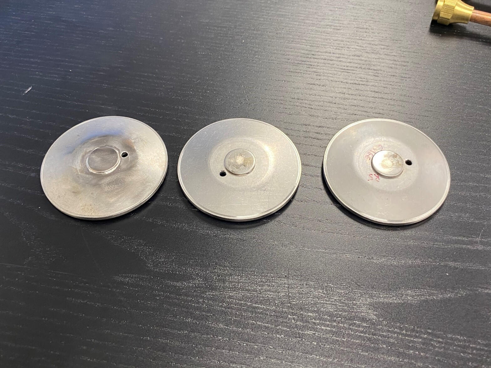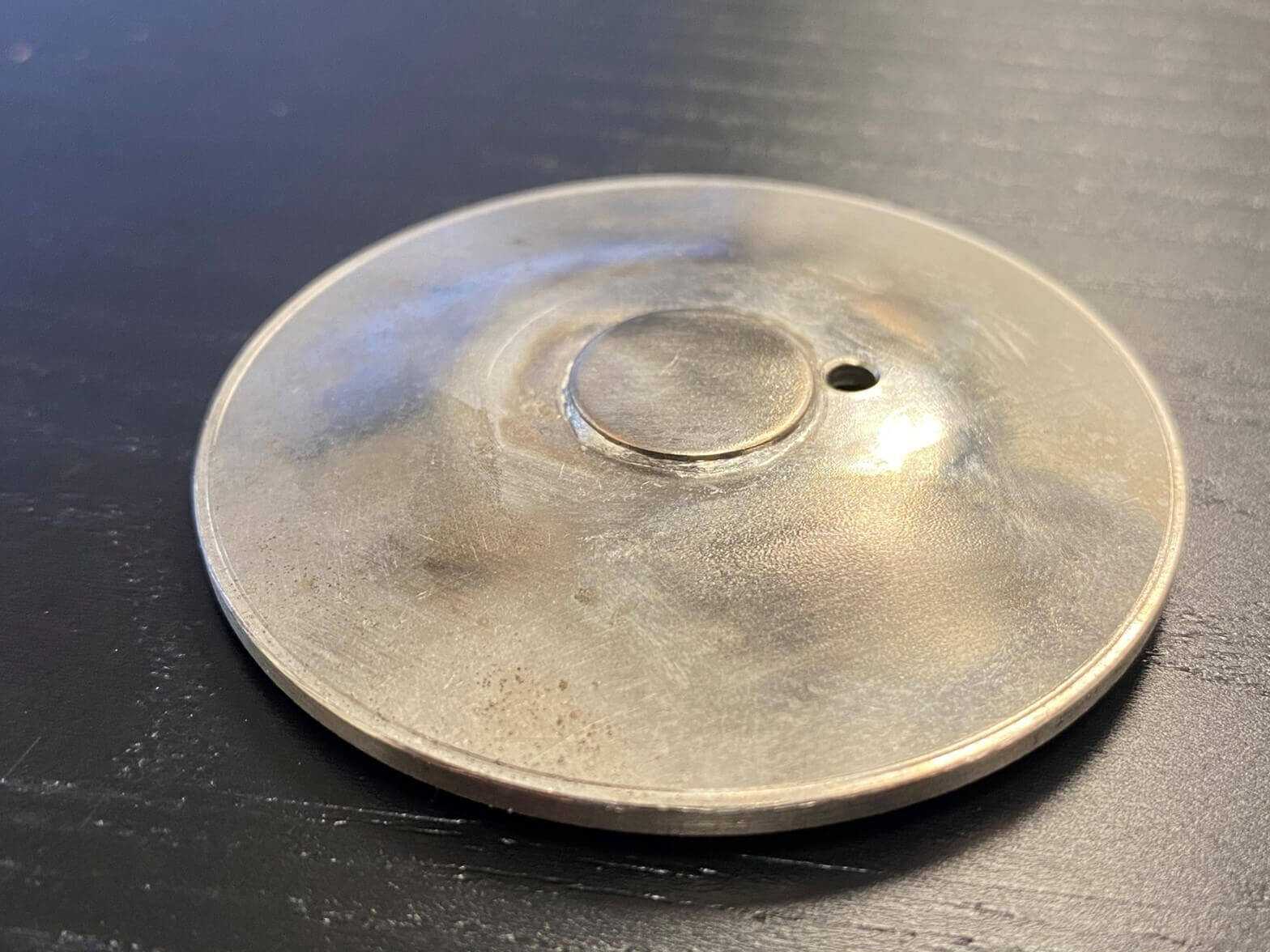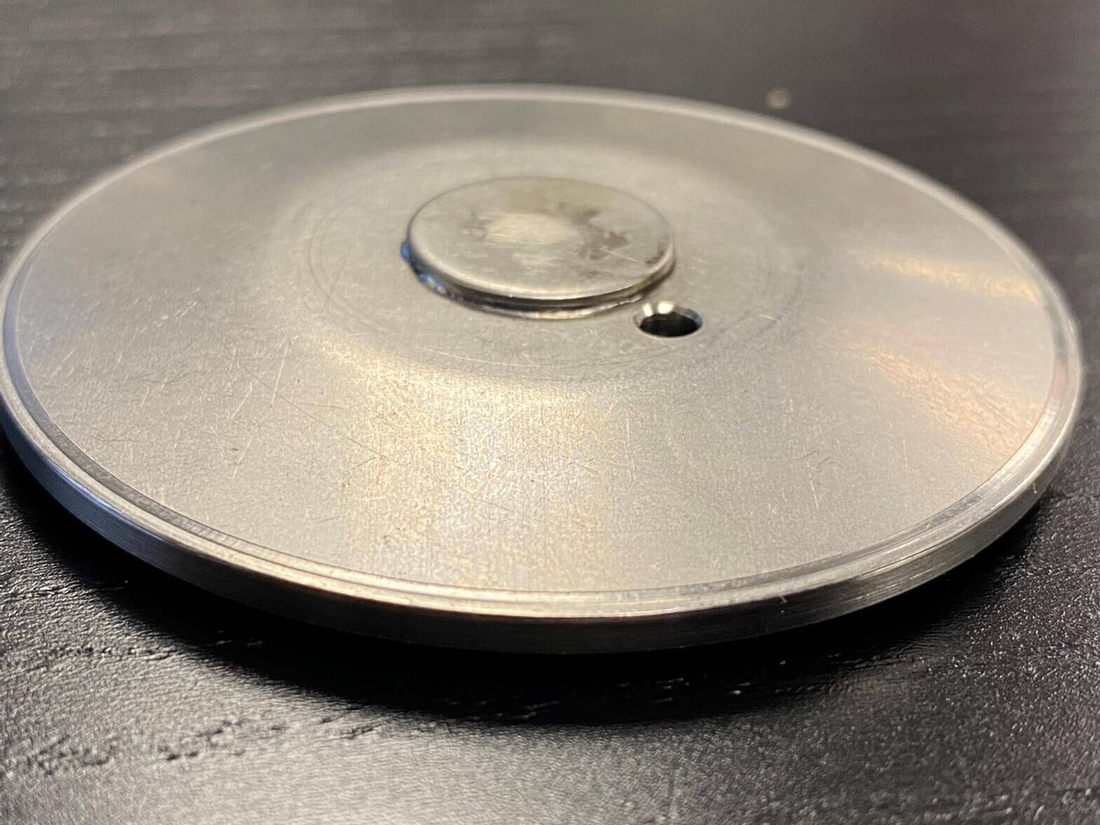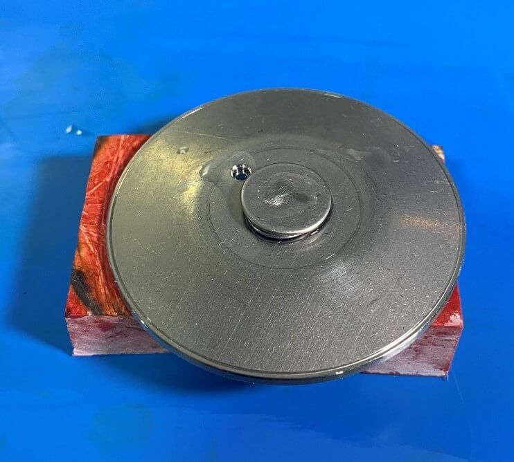 Our goal is to solder a 0.25″ (6.35 mm) pin to a circular 2.5″(63.5 mm) stainless-steel plate which is .040″ (10.16 mm) thick. Before we begin the induction soldering process, a solder ring is placed under the joint. Then a high acid flux is applied around the solder joint location. This type of soldering flux is necessary because it will help clean the joint of any residual oxides which would prevent a good connection to be made between the parts. The heat is intentionally focused onto the head of the pin in order to transfer the heat down. This way it is concentrated only where it needs to be and heat spread to other areas of the part are limited.
